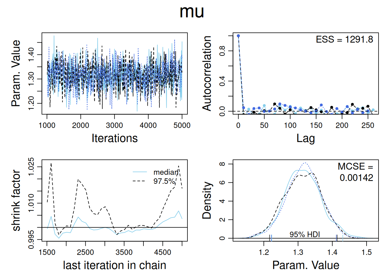 diagMCMC(as.mcmc(jags_fit),parName = 'mu.adj')