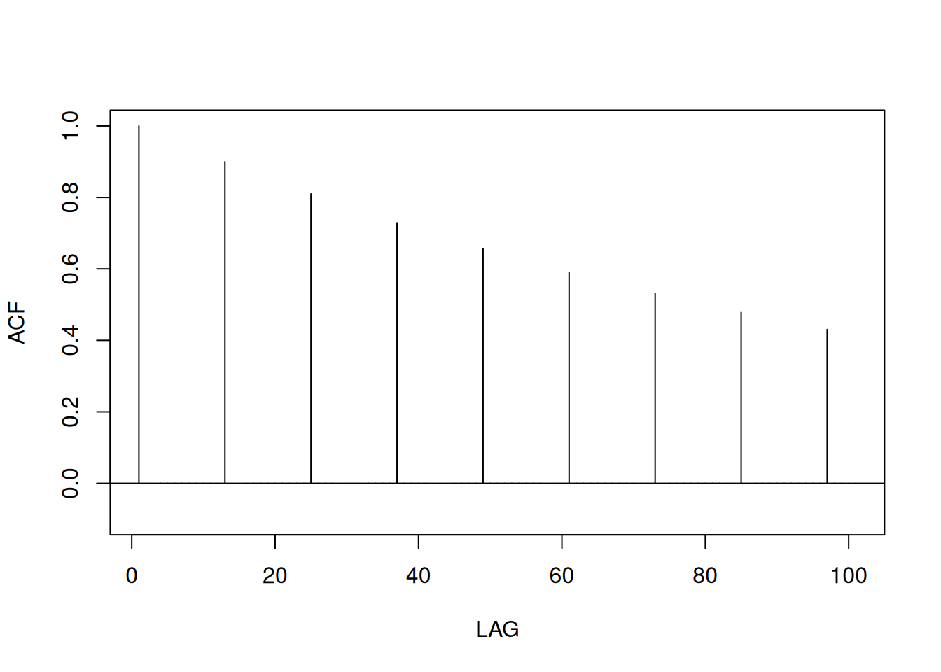\[ \begin{equation*} \rho(h)=\frac{\gamma(h)}{\gamma(0)}=\phi^{h},\quad h\ge 0, \end{equation*} \]