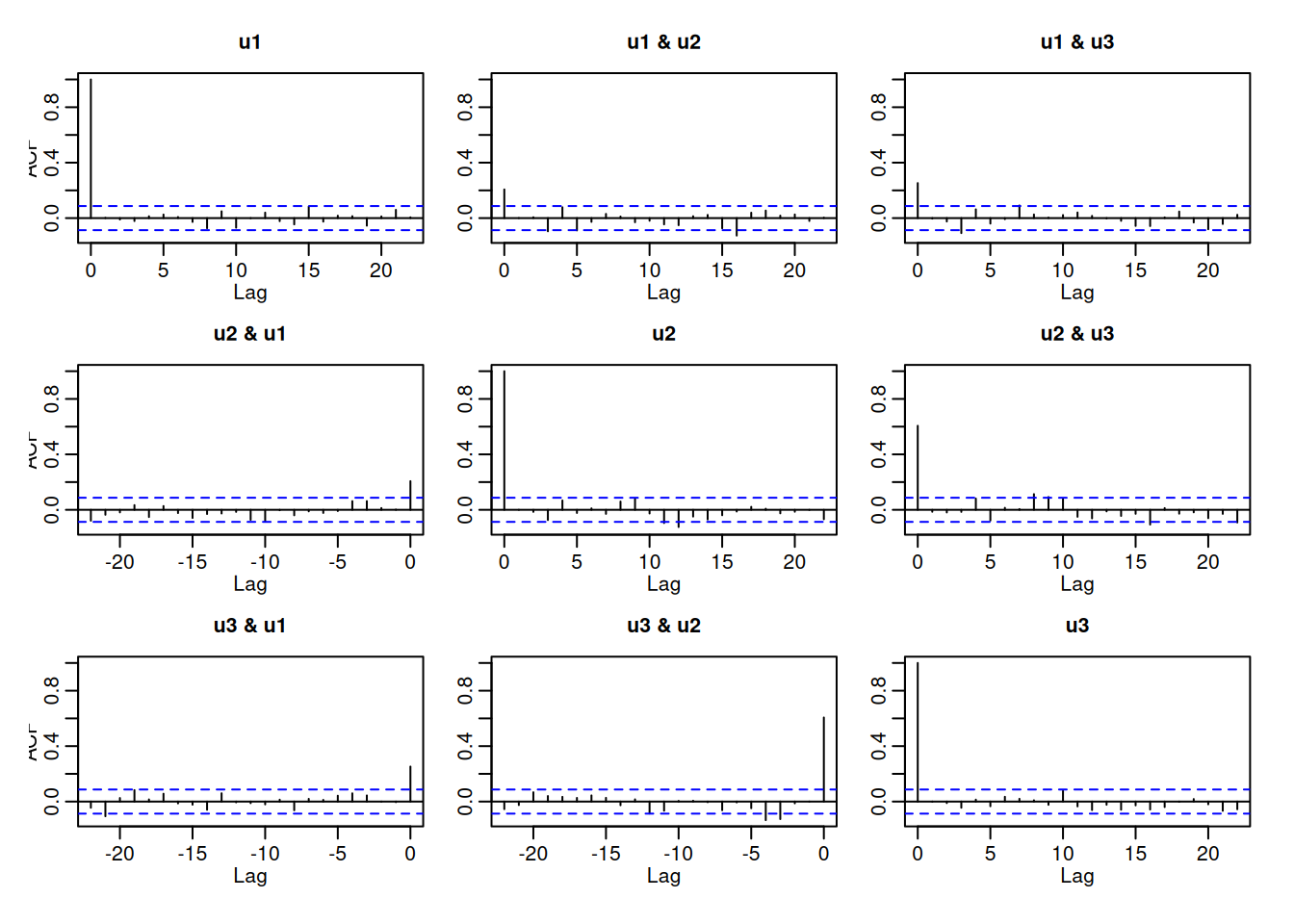 Interpretación: BIC selecciona (p=2) (frente a AIC/FPE/HQ). El diagnóstico multivariante indica que el modelo no captura efectos concurrentes (correlaciones residuales no nulas), por lo que el test Q (equivalente al Ljung-Box univariado) rechaza ruido blanco.