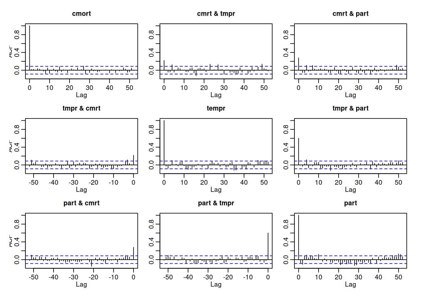 library(marima)# Definición del modelo VARMA(2,1)model <-define.model(kvar =3, ar =c(1, 2), ma =c(1))arp <- model$ar.pattern; map <- model$ma.pattern# Detrendeo de mortalidad (cmort) y armado de matriz de datoscmort.d <-resid(detr <-lm(cmort ~time(cmort), na.action =NULL))xdata <-matrix(cbind(cmort.d, tempr, part), ncol =3) # quitar atributos ts# Ajuste VARMA con penalizaciónfit <-marima(xdata, ar.pattern = arp, ma.pattern = map, means =c(0, 1, 1),penalty =1)